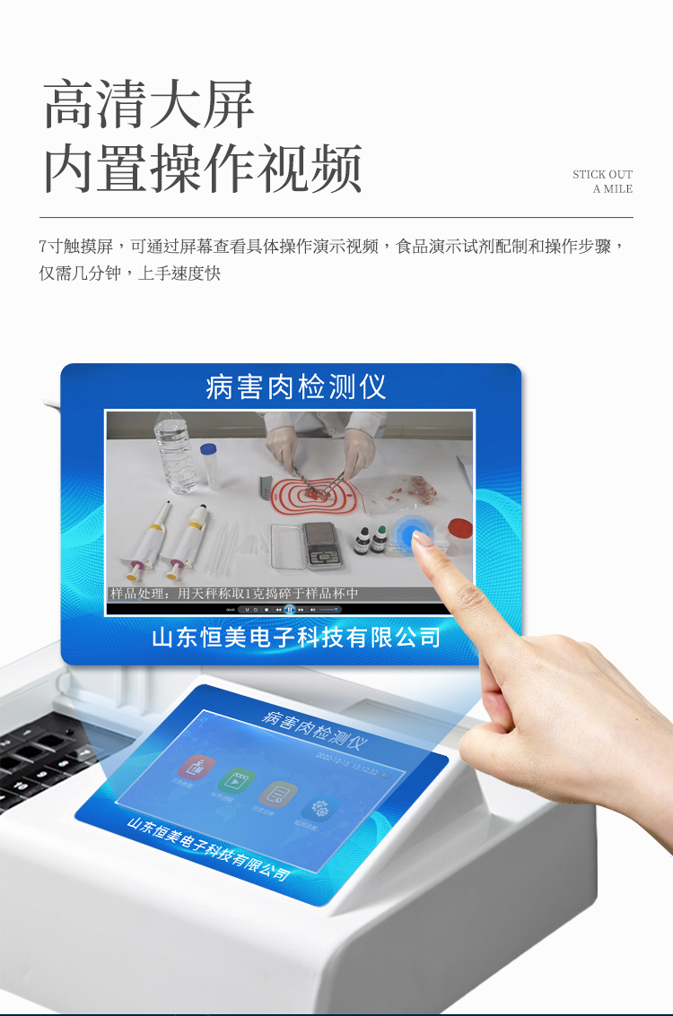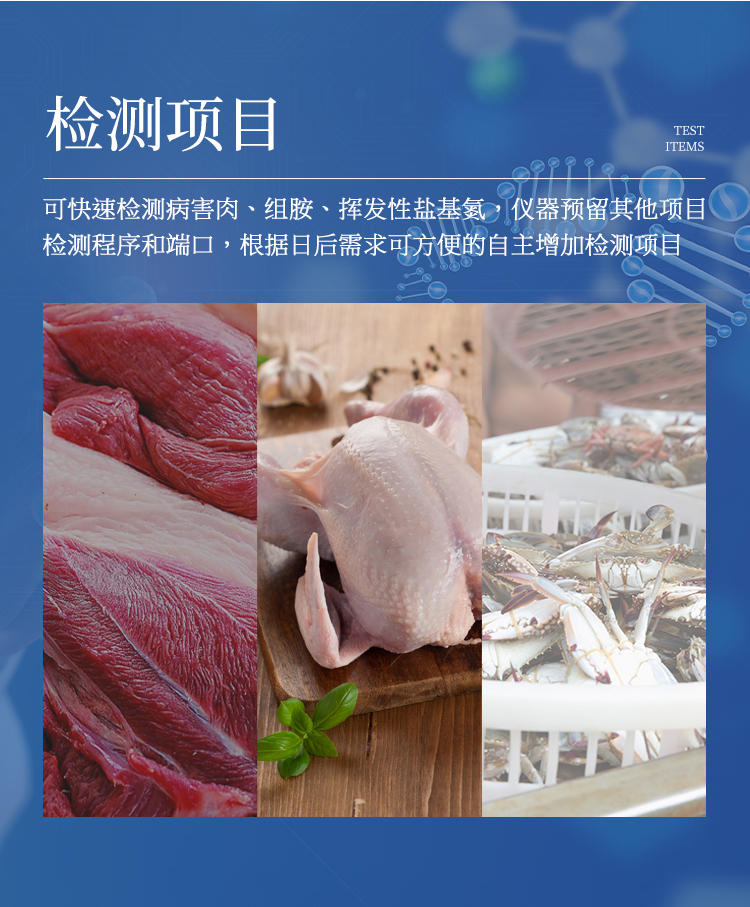 可快速檢測(cè)病害肉、組胺、揮發(fā)性鹽基氮,儀器預(yù)留其他項(xiàng)目檢測(cè)程序和端口,根據(jù)日后需求可方便的自主增加檢測(cè)項(xiàng)目。