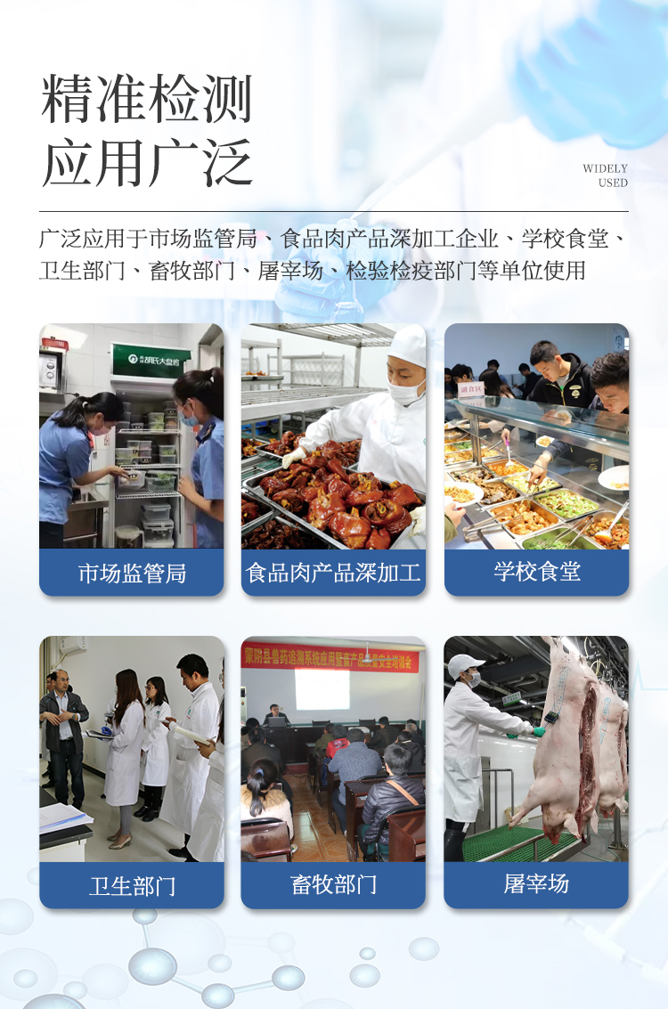 該多功能食品安全檢測(cè)儀為集成一體化食品安全快速檢測(cè)分析設(shè)備,廣泛應(yīng)用于食藥監(jiān)局、衛(wèi)生部門、學(xué)校食堂、農(nóng)業(yè)部門、養(yǎng)殖場(chǎng)、屠宰場(chǎng)、食品肉產(chǎn)品深加工企業(yè)、檢驗(yàn)檢疫部門等單位使用。