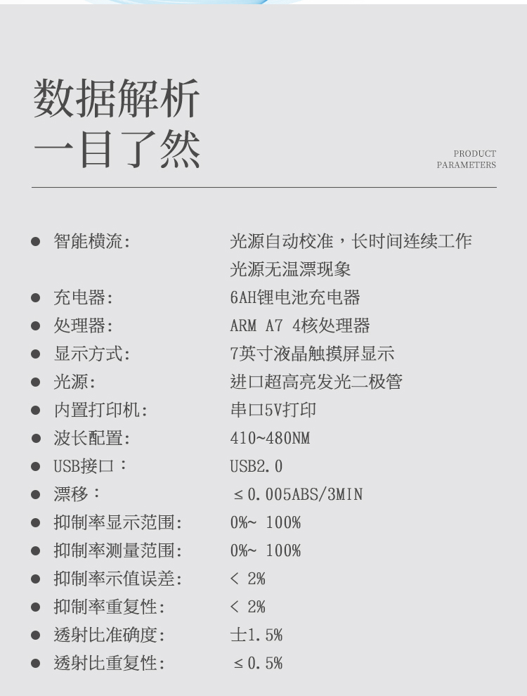 5、智能恒流穩(wěn)壓,光強(qiáng)自動(dòng)校準(zhǔn),長(zhǎng)時(shí)間連續(xù)工作光源無溫漂現(xiàn)象。