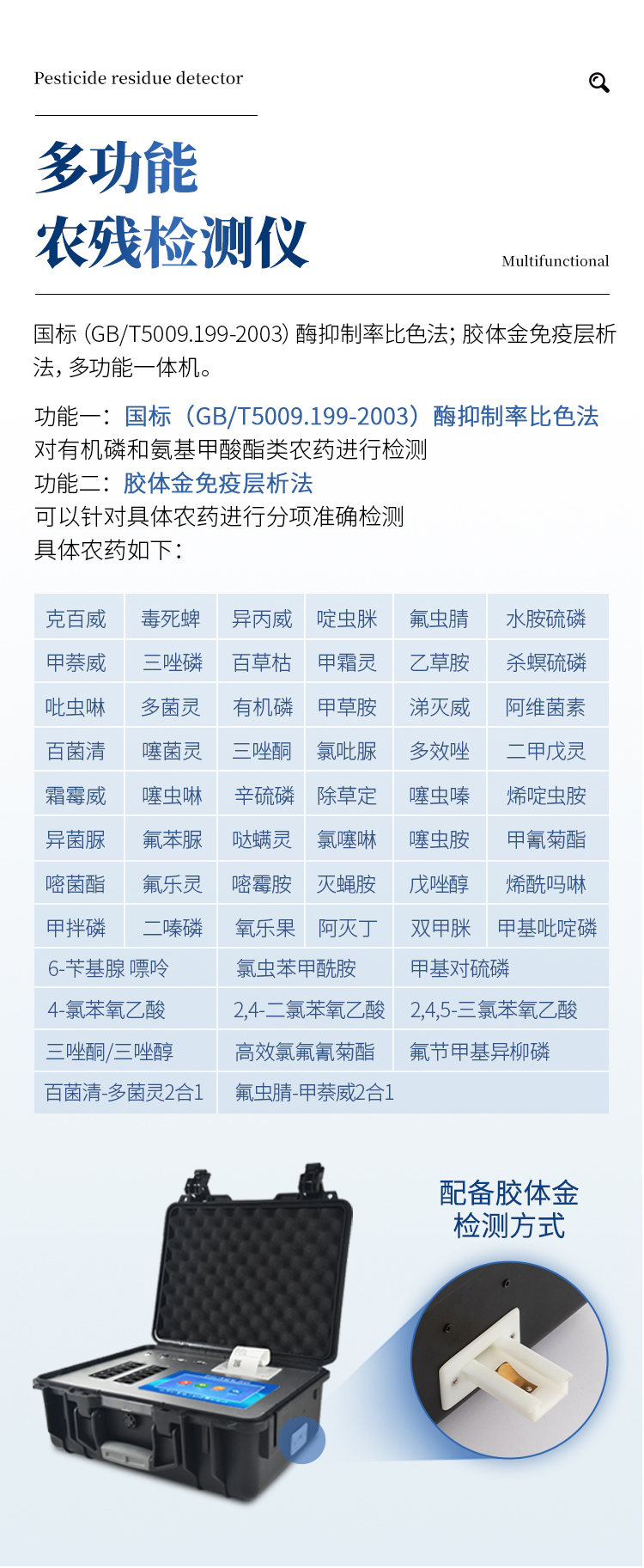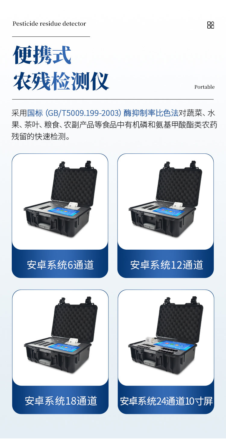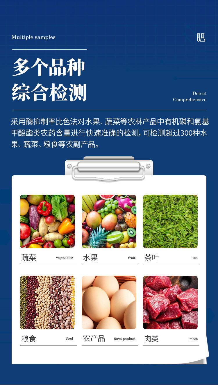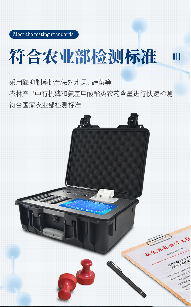 檢測(cè)標(biāo)準(zhǔn):依據(jù)國(guó)家標(biāo)準(zhǔn)方法(GB/T5009.199-2003)以及世界衛(wèi)生組織WHO、世界糧農(nóng)組織FAO殘留農(nóng)藥檢測(cè)標(biāo)準(zhǔn)、世界環(huán)境保護(hù)局EPA參照攝入量等要求來(lái)設(shè)計(jì)。采用酶抑制率比色法對(duì)水果、蔬菜等農(nóng)林產(chǎn)品中有機(jī)磷和氨基甲酸酯類農(nóng)藥含量進(jìn)行快速準(zhǔn)確的檢測(cè),乙酰膽堿酯酶和丁酰膽堿酯酶試劑均可以使用,符合國(guó)家標(biāo)準(zhǔn)和農(nóng)業(yè)部標(biāo)準(zhǔn)的要求。