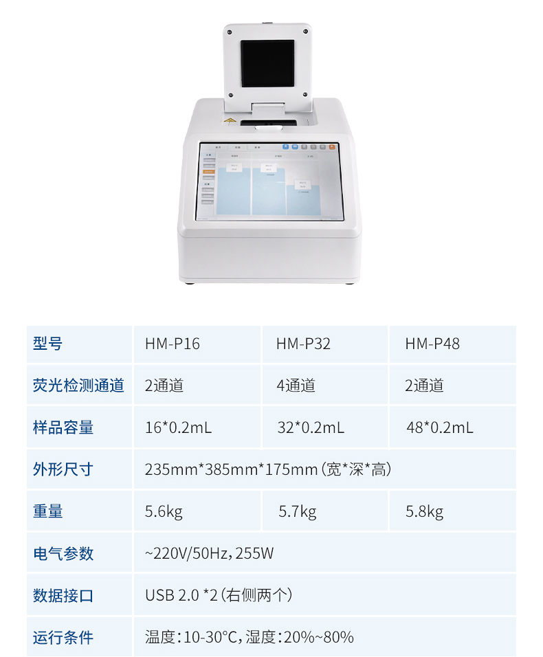 HM-P16型非洲豬瘟PCR檢測儀主要用于運行實時熒光定量PCR實驗,通過熒光激發(fā)和采集的方式,對實驗過程進行實時監(jiān)控,將實驗過程數(shù)據(jù)繪制成熒光曲線,實時呈現(xiàn)于儀器顯示界面,并對實驗數(shù)據(jù)進行擬合和分析,*后可生成PDF格式的實驗報告。