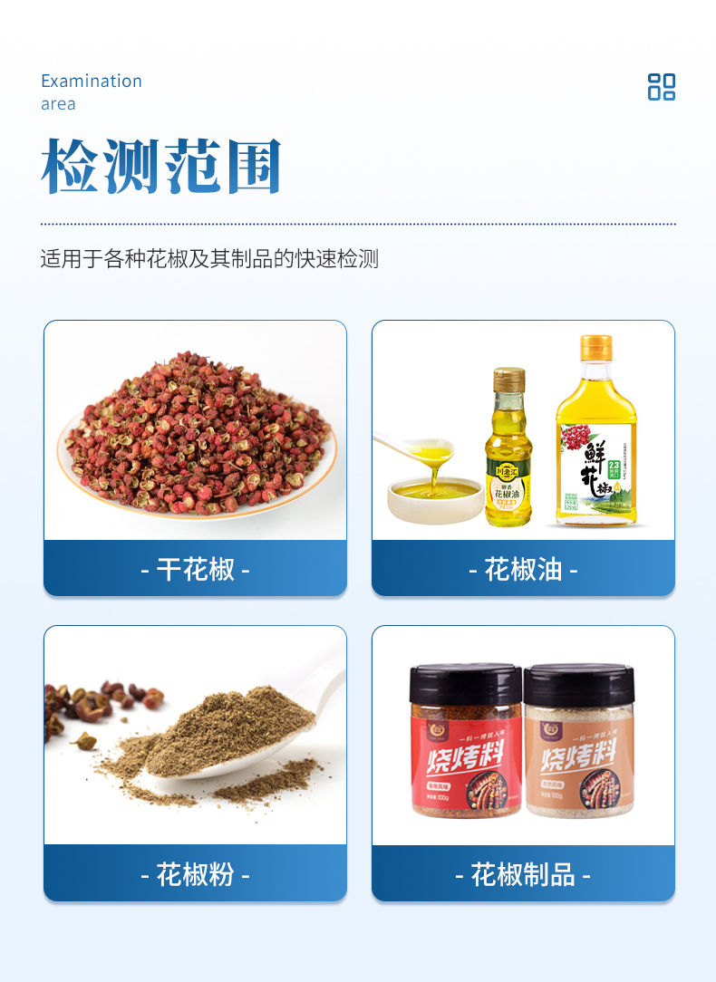 1. 樣品檢測(cè)范圍:花椒5-30mg/g 花椒油 0.6-3mg/g;