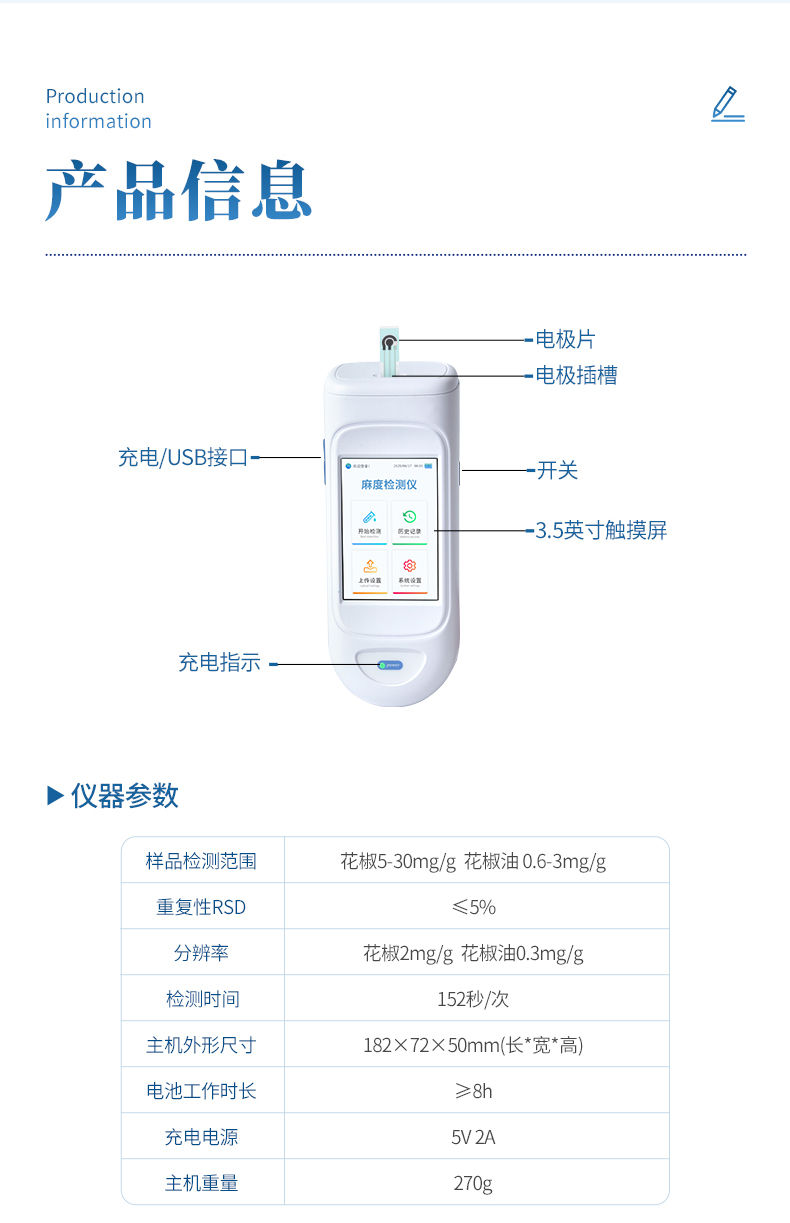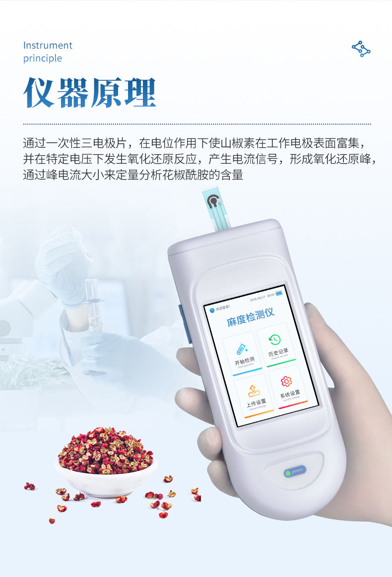 花椒麻度分析儀采用電化學(xué)測(cè)量方法,可快速、便捷地檢測(cè)各種花椒及花椒制品中的天然山椒素的含量,適用于干花椒、花椒油、花椒粉等花椒及其制品的快速檢測(cè)。