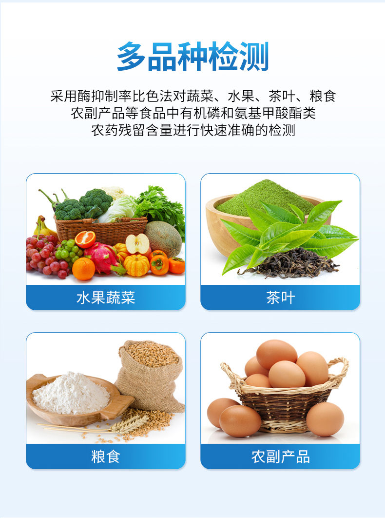 采用酶抑制率比色法對(duì)蔬菜、水果、茶葉、糧食、農(nóng)副產(chǎn)品等食品中有機(jī)磷和氨基甲酸酯類農(nóng)藥殘留含量進(jìn)行快速準(zhǔn)確的檢測(cè);廣泛應(yīng)用于果蔬茶生產(chǎn)基地和農(nóng)貿(mào)批發(fā)銷售市場(chǎng)現(xiàn)場(chǎng)檢測(cè)、農(nóng)業(yè)部門、學(xué)校食堂、市場(chǎng)監(jiān)管局、檢測(cè)中心等的安全速測(cè)。