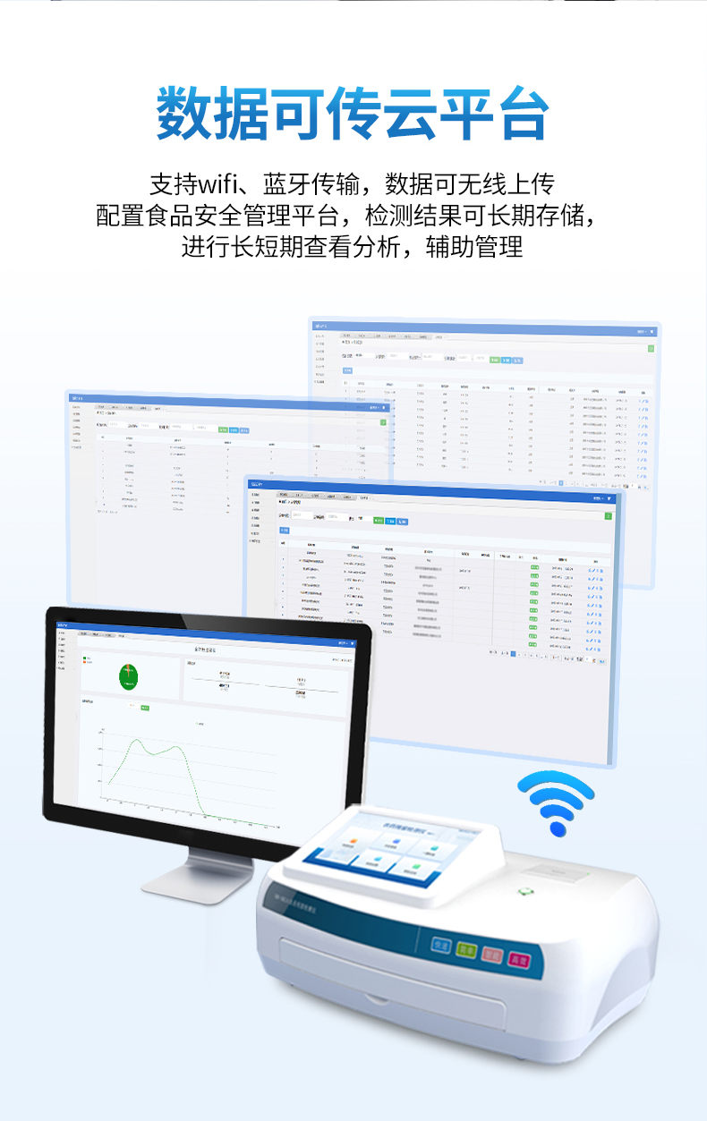 6、配置食品安全管理平臺(tái),檢測(cè)結(jié)果可長(zhǎng)期存儲(chǔ),進(jìn)行長(zhǎng)短期查看分析,輔助管理。