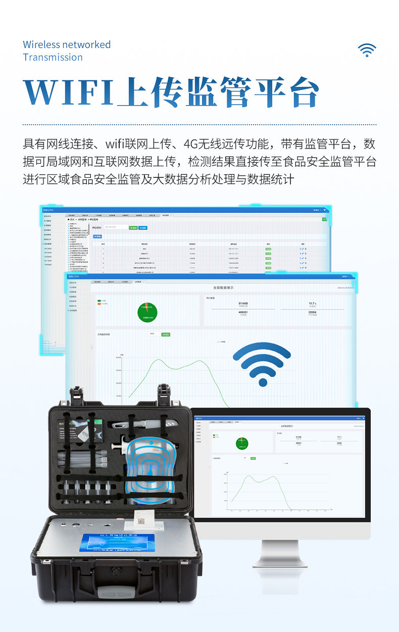 5、儀器帶有監(jiān)管平臺,數(shù)據(jù)可局域網(wǎng)和互聯(lián)網(wǎng)數(shù)據(jù)上傳,檢測結果直接傳至食品安全監(jiān)管平臺。進行區(qū)域食品安全監(jiān)管及大數(shù)據(jù)分析處理與數(shù)據(jù)統(tǒng)計,檢測區(qū)域食品安全長短期動態(tài),達到食品安全問題預估、預警