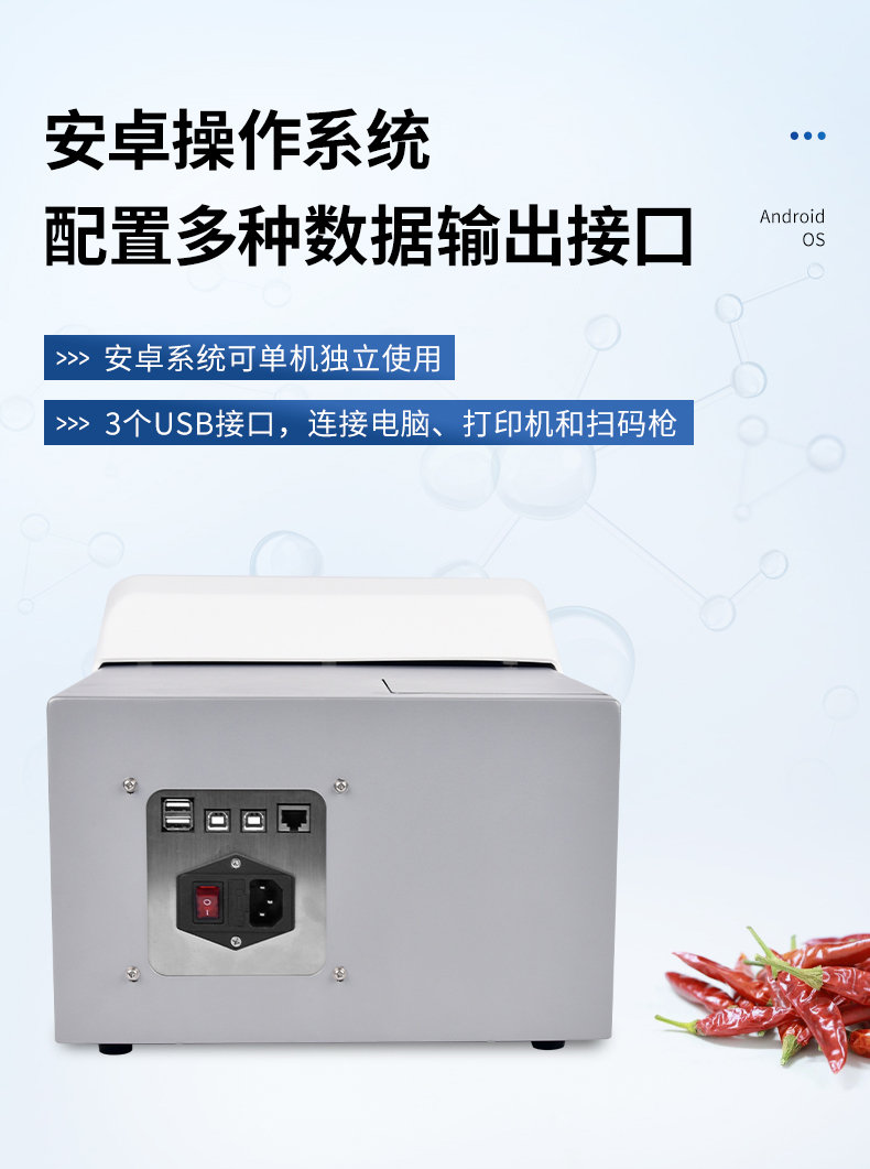 辣椒素檢測儀主要用于各種辣椒及辣椒制品中的天然辣椒素、辣度檢測。儀器由亮度發(fā)光二管光源、比色池、高靈敏度集成光電池、微處理器、漢字大屏幕液晶屏、嵌入式微型熱敏打印機(jī)集成芯片構(gòu)成,可直接在大屏幕液晶屏上顯示出被測樣品中相關(guān)指標(biāo)的含量,并打印出分析結(jié)果,還可以通過計算機(jī)接口將數(shù)據(jù)傳輸?shù)诫娔X進(jìn)行數(shù)據(jù)分析。