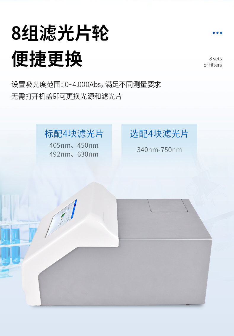 設(shè)置吸光度范圍:0~4.000Abs,滿足不同測量要求,并配備了8組濾光片輪,標(biāo)配4組濾光片,根據(jù)使用 可選配340 nm~750nm波長的濾光片組合使用。設(shè)計合理無需打開機(jī)蓋就可更換光源和濾光片;