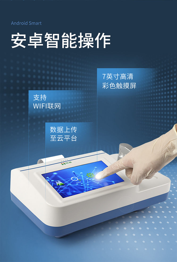 1、安卓智能操作系統(tǒng),儀器可通過(guò)WiFi聯(lián)網(wǎng),將數(shù)據(jù)上傳至云平臺(tái);