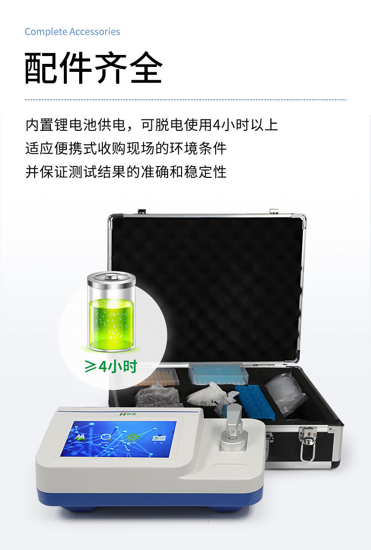 9、內(nèi)置鋰電池供電,交直流兩用,可脫電使用4小時(shí)以上,適應(yīng)便攜式收購(gòu)現(xiàn)場(chǎng)的環(huán)境條件并保證測(cè)試結(jié)果的準(zhǔn)確和穩(wěn)定性;