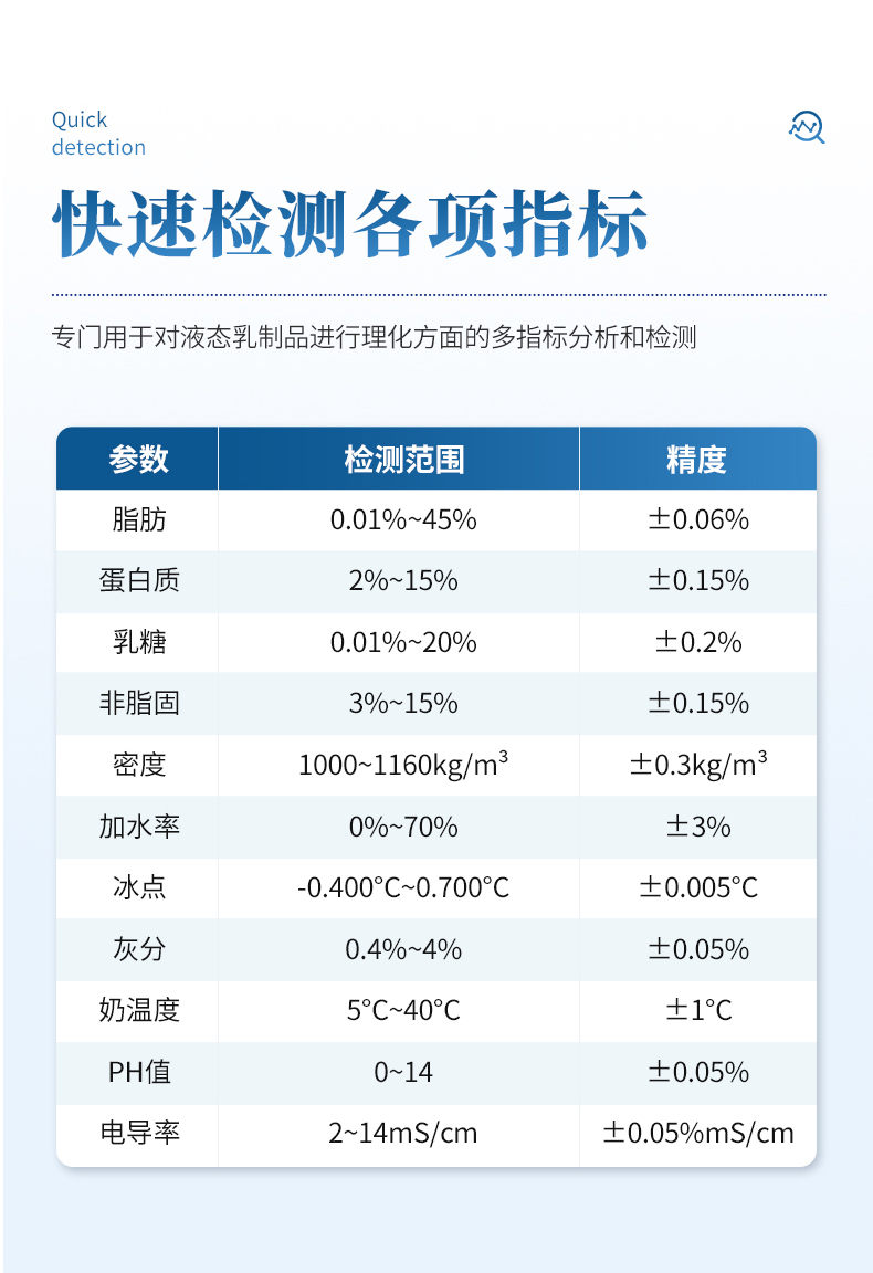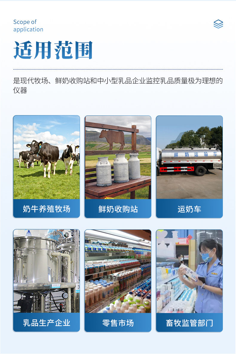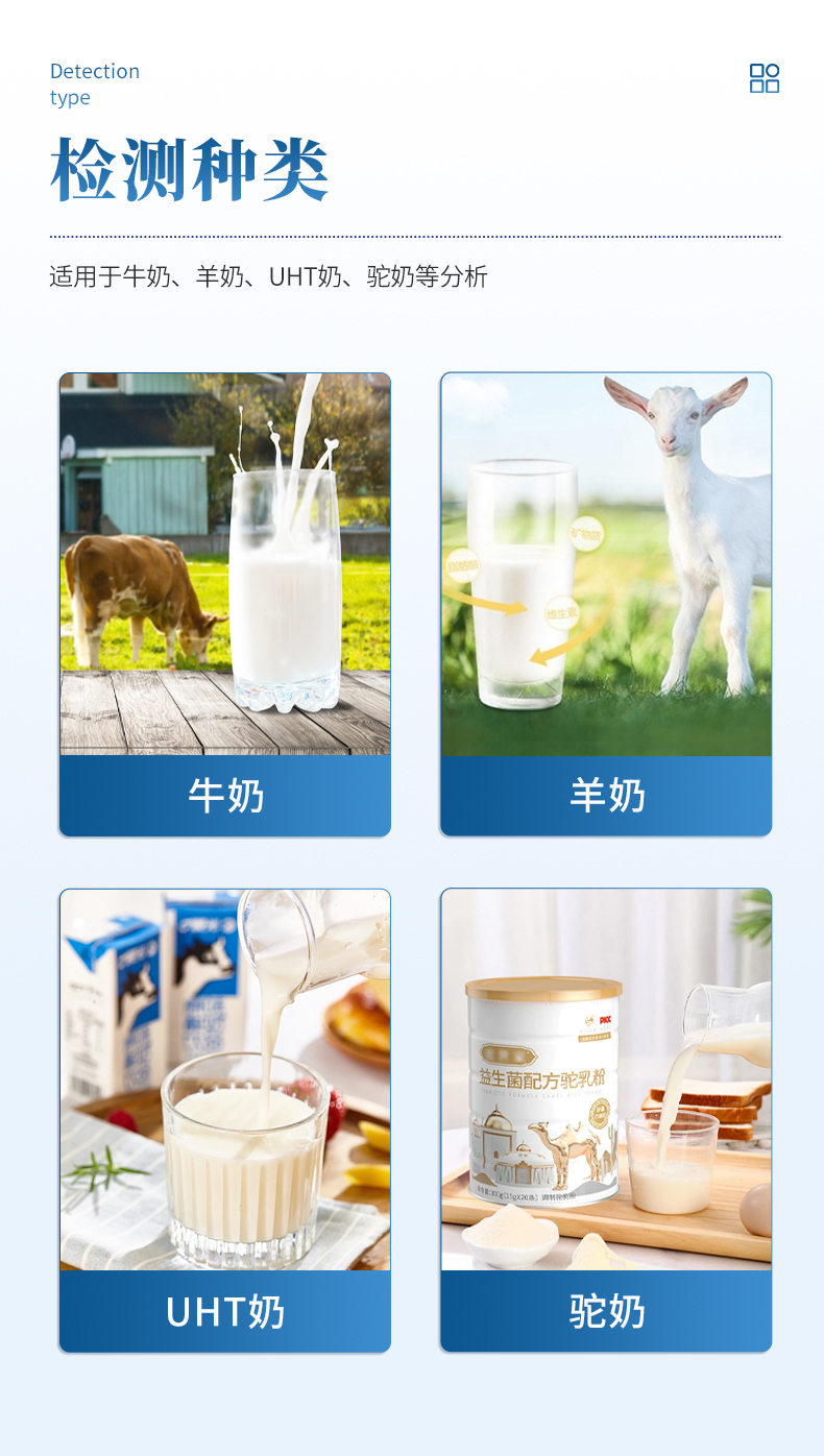 該儀器主要用于乳制品中脂肪,蛋白質(zhì)、乳糖、非脂固形物、密度、摻水率、冰點、灰份、溫度、PH值、電導(dǎo)率的測定,適用于牛奶、羊奶、UHT奶等分析,是現(xiàn)代牧場、鮮奶收購站和中小型乳品企業(yè)監(jiān)控乳品質(zhì)量極為理想的儀器。