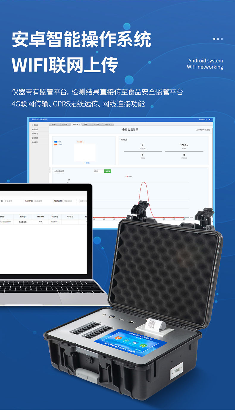 4、儀器帶有監(jiān)管平臺,數(shù)據(jù)可局域網(wǎng)和互聯(lián)網(wǎng)數(shù)據(jù)上傳,檢測結(jié)果直接傳至食品安全監(jiān)管平臺。進(jìn)行區(qū)域食品安全監(jiān)管及大數(shù)據(jù)分析處理與數(shù)據(jù)統(tǒng)計(jì),檢測區(qū)域食品安全長短期動態(tài),達(dá)到食品安全問題預(yù)估、預(yù)警