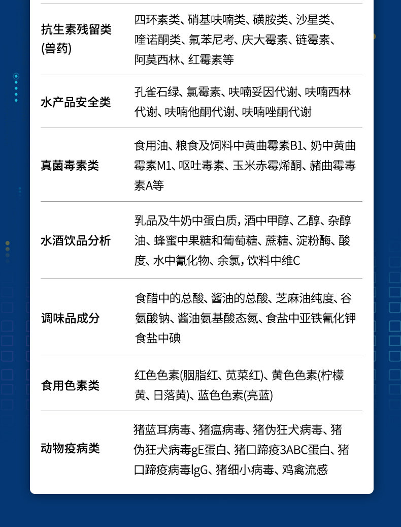 果蔬中:農(nóng)藥殘留,病害肉診斷:組胺、揮發(fā)性鹽基氮、肉制品酸價、水發(fā)產(chǎn)品中組胺