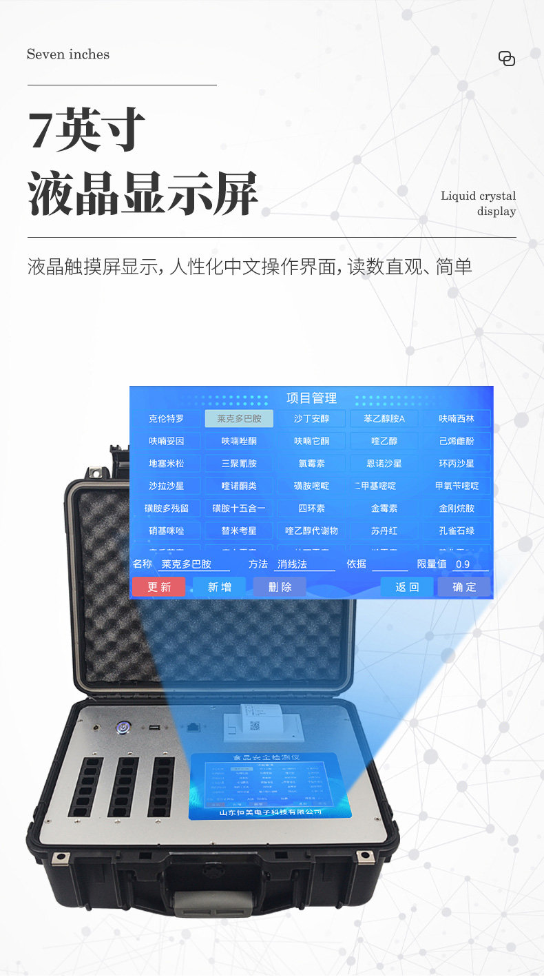 食品安全檢測設(shè)備可快速檢測200多項目,包含非食用化學(xué)物質(zhì)、濫用食品添加劑、農(nóng)藥殘留、獸藥殘留、重金屬、病害肉、營養(yǎng)強(qiáng)化劑、抗生素類殘留、激素類殘留、真菌毒素類殘留、化學(xué)類殘留等現(xiàn)場的定性定量檢測。