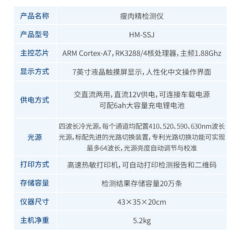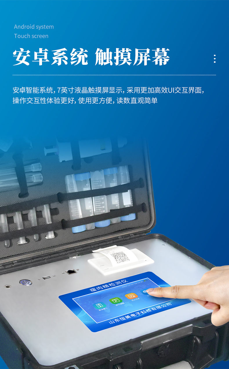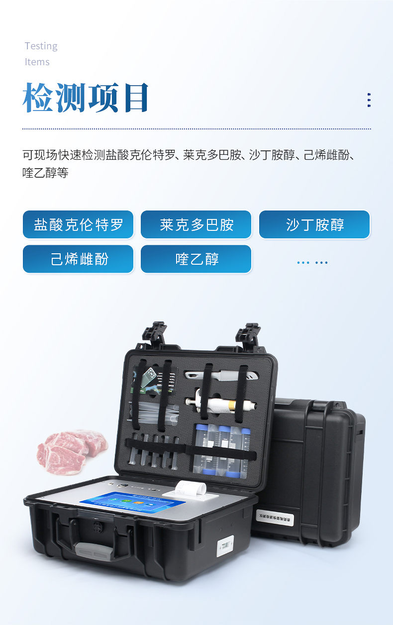 瘦肉精快速檢測儀可現(xiàn)場快速檢測鹽酸克倫特羅、萊克多巴胺、沙丁胺醇、己烯雌酚、喹乙醇等。儀器預(yù)留其他項目檢測程序和端口,根據(jù)日后需求可方便的自主增加檢測項目。日后可升級為檢測抗生素、獸藥殘留、動物疫病、病害肉、的綜合類型儀器。