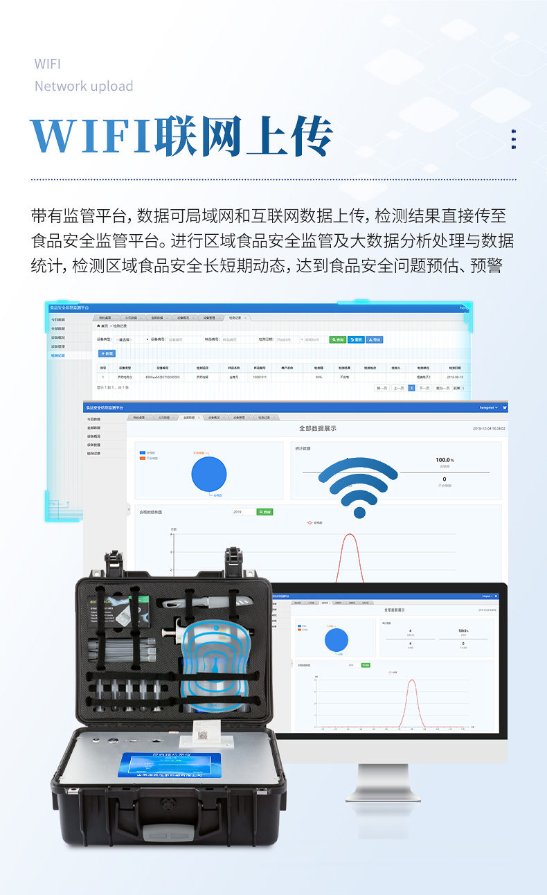 4、儀器帶有監(jiān)管平臺,數(shù)據(jù)可局域網(wǎng)和互聯(lián)網(wǎng)數(shù)據(jù)上傳,檢測結(jié)果直接傳至食品安全監(jiān)管平臺。進行區(qū)域食品安全監(jiān)管及大數(shù)據(jù)分析處理與數(shù)據(jù)統(tǒng)計,檢測區(qū)域食品安全長短期動態(tài),達到食品安全問題預(yù)估、預(yù)警