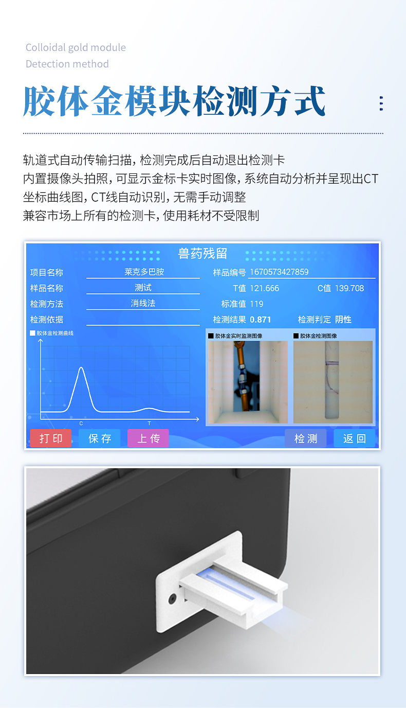 6、膠體金模塊檢測(cè)方式:軌道式自動(dòng)傳輸掃描,檢測(cè)完成后自動(dòng)退出檢測(cè)卡。