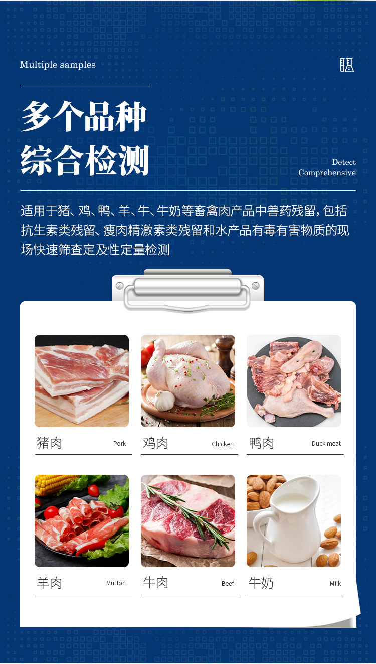 獸藥殘留檢測(cè)儀適用于豬、雞、鴨、羊、牛、牛奶等畜禽肉產(chǎn)品中獸藥殘留,包括抗生素類殘留、瘦肉精激素類殘留和水產(chǎn)品有毒有害物質(zhì)的現(xiàn)場(chǎng)快速篩查定及性定量檢測(cè)。