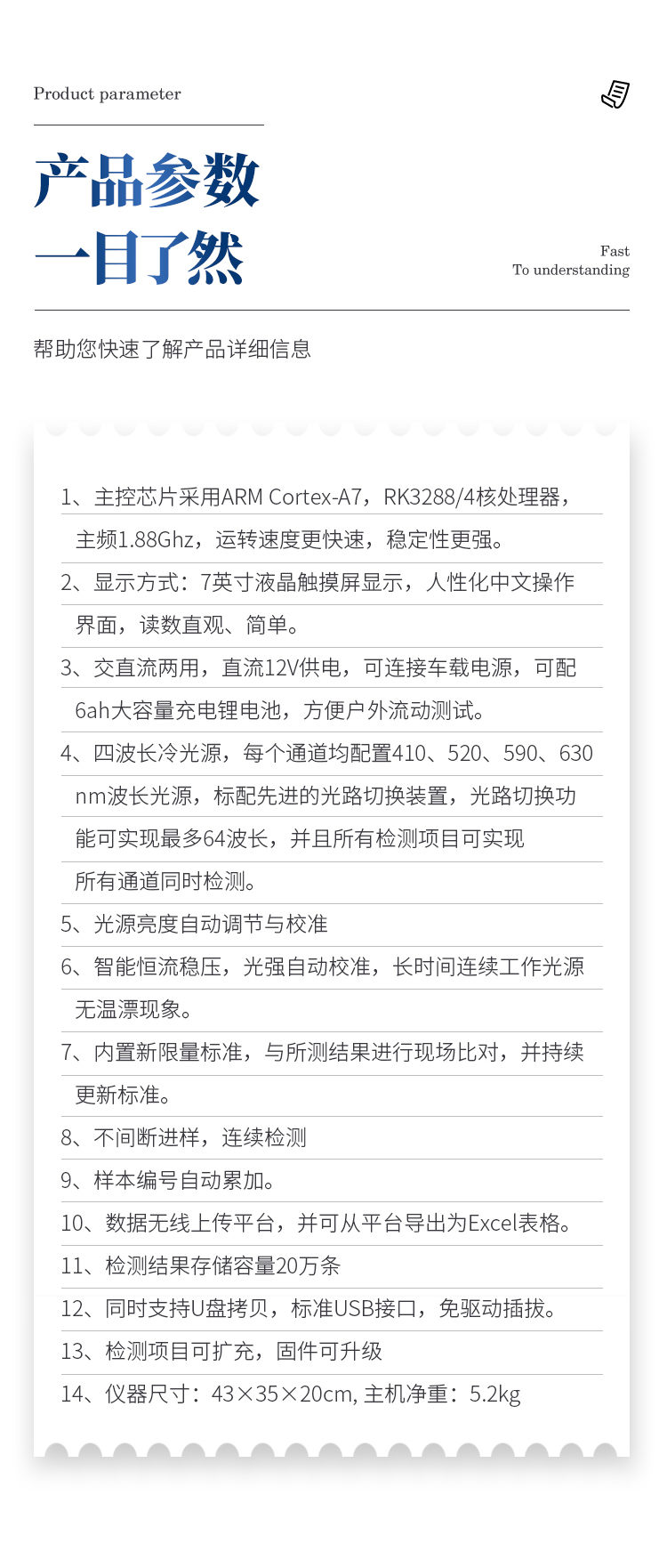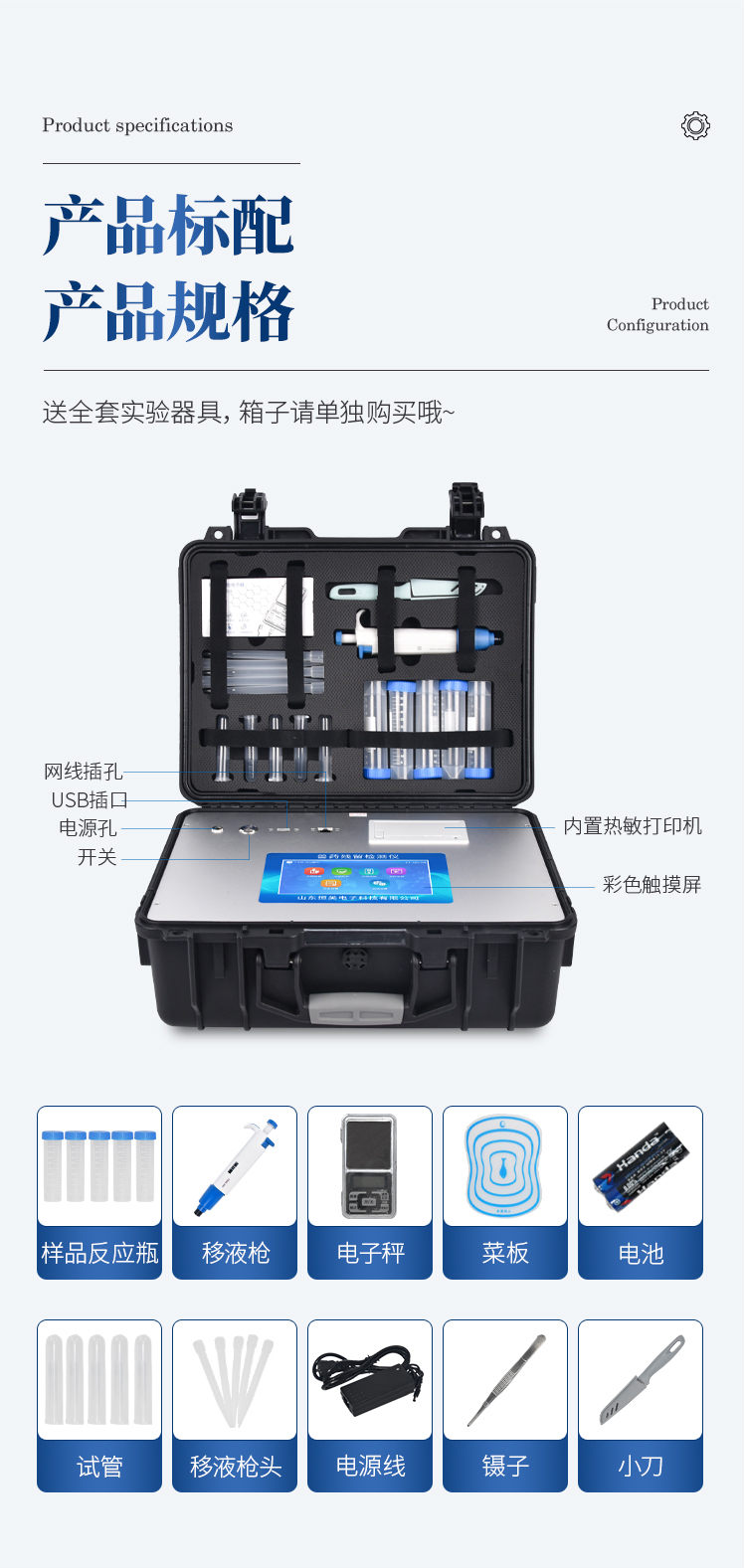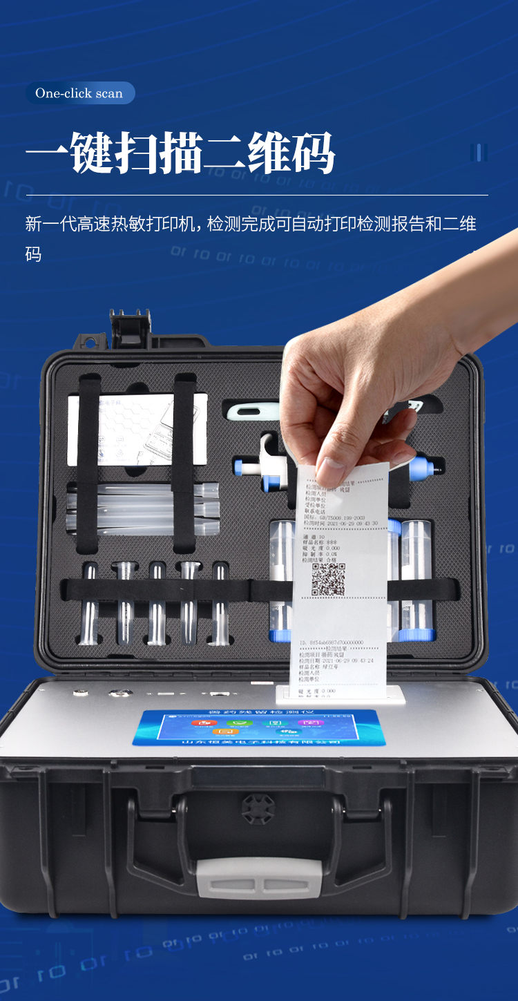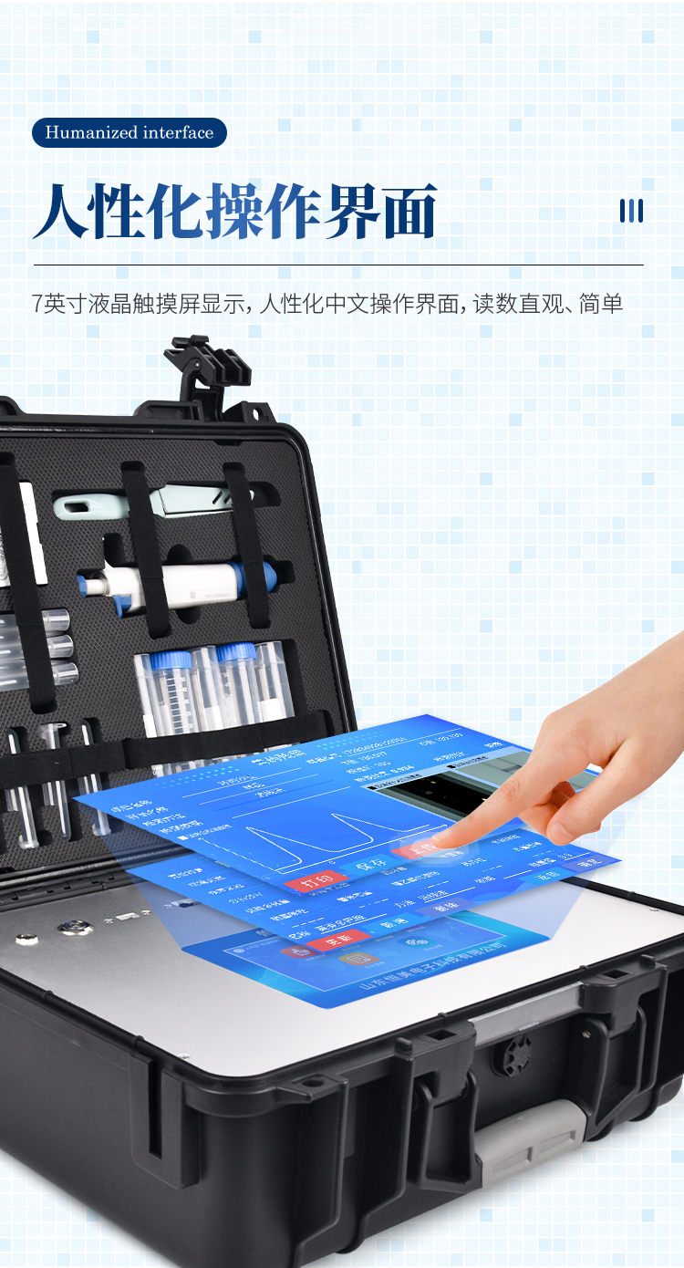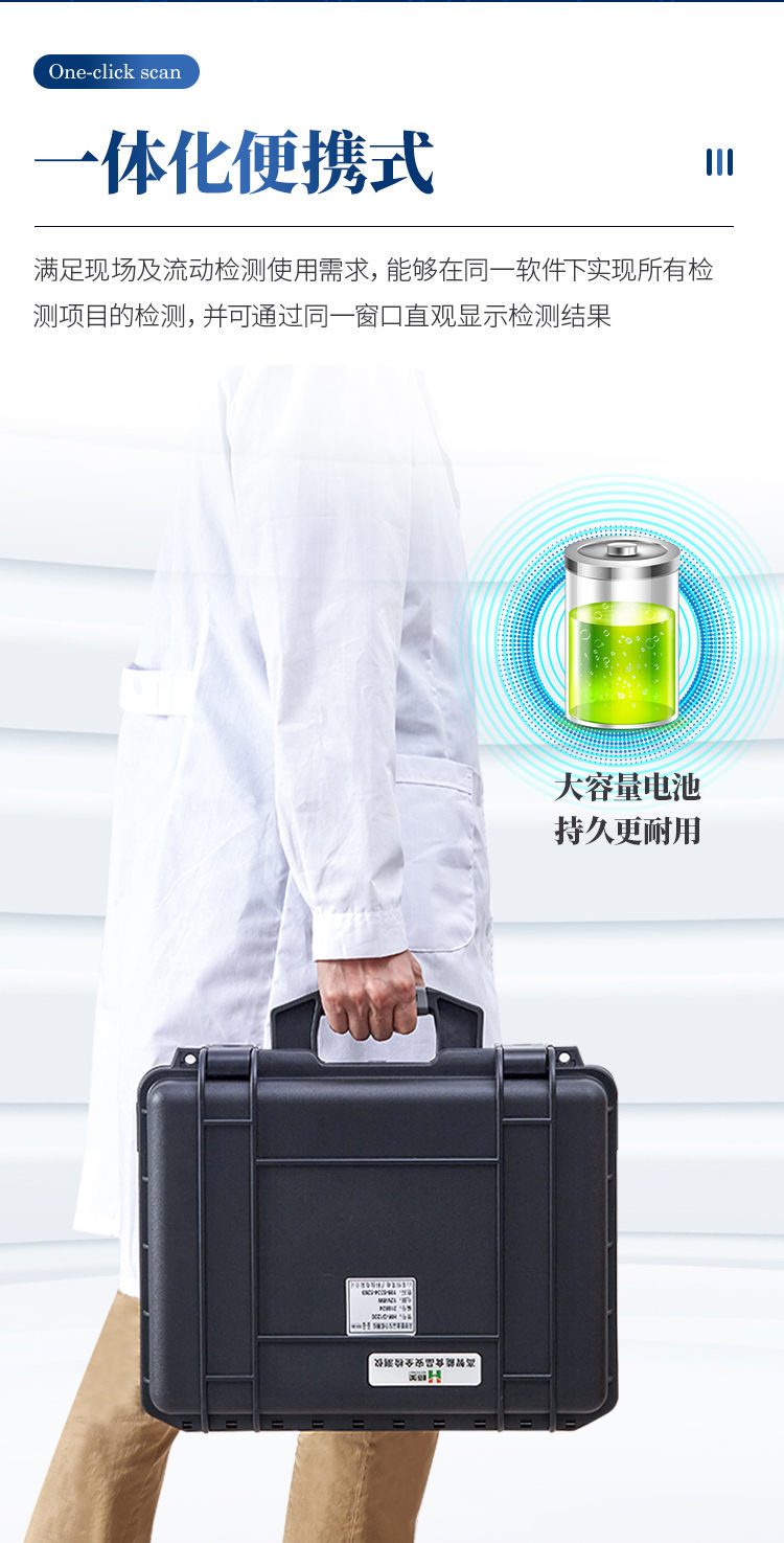 6、一體化便攜式快檢設(shè)備,滿足現(xiàn)場(chǎng)及流動(dòng)檢測(cè)使用需求,能夠在同一軟件下實(shí)現(xiàn)所有檢測(cè)項(xiàng)目的檢測(cè),并可通過同一窗口直觀顯示檢測(cè)結(jié)果。