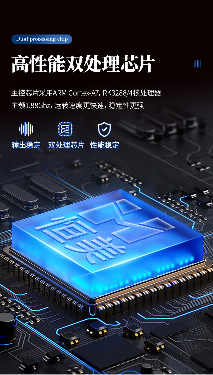 1、主控芯片采用ARM Cortex-A7,RK3288/4核處理器,主頻1.88Ghz,運(yùn)轉(zhuǎn)速度更快速,穩(wěn)定性更強(qiáng)。