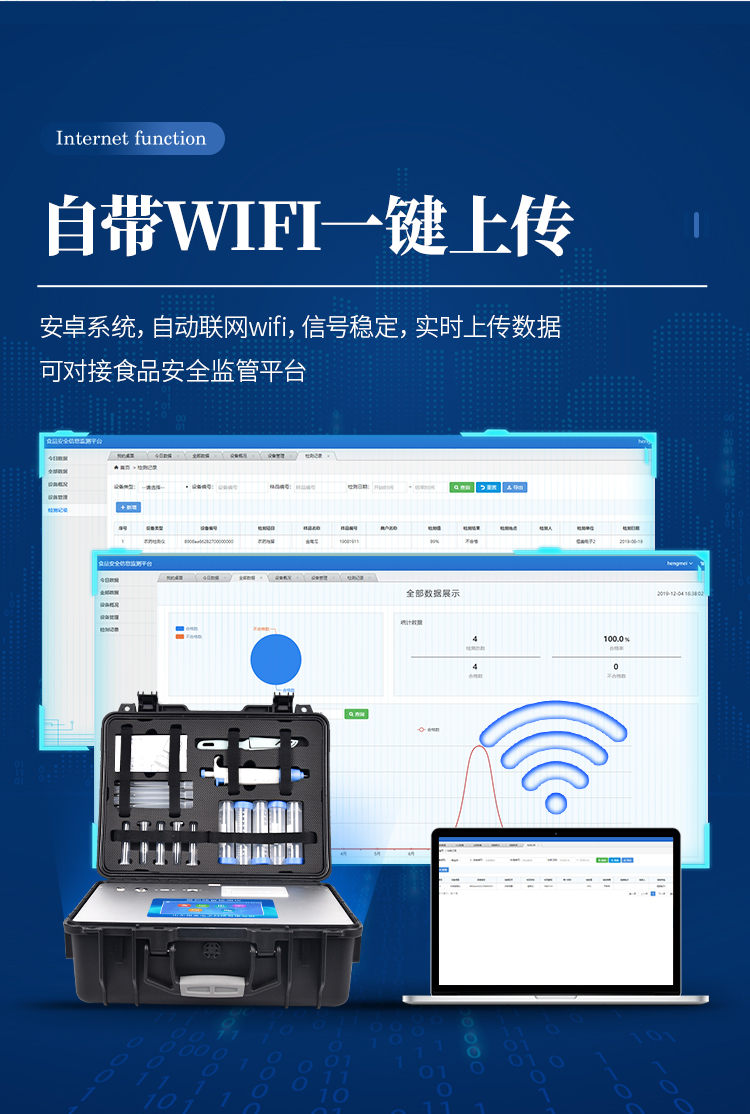 4、儀器帶有監(jiān)管平臺(tái),數(shù)據(jù)可局域網(wǎng)和互聯(lián)網(wǎng)數(shù)據(jù)上傳,檢測(cè)結(jié)果直接傳至食品安全監(jiān)管平臺(tái)。進(jìn)行區(qū)域食品安全監(jiān)管及大數(shù)據(jù)分析處理與數(shù)據(jù)統(tǒng)計(jì),檢測(cè)區(qū)域食品安全長(zhǎng)短期動(dòng)態(tài),達(dá)到食品安全問題預(yù)估、預(yù)警