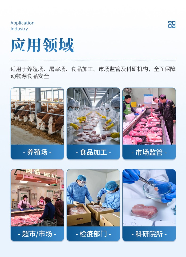 主要應(yīng)用場景:養(yǎng)殖場/屠宰場、食品加工企業(yè)、市場監(jiān)管部門(食藥監(jiān)、農(nóng)業(yè)農(nóng)村部等)、第三方檢測機(jī)構(gòu)、農(nóng)產(chǎn)品批發(fā)市場/超市、科研院所。