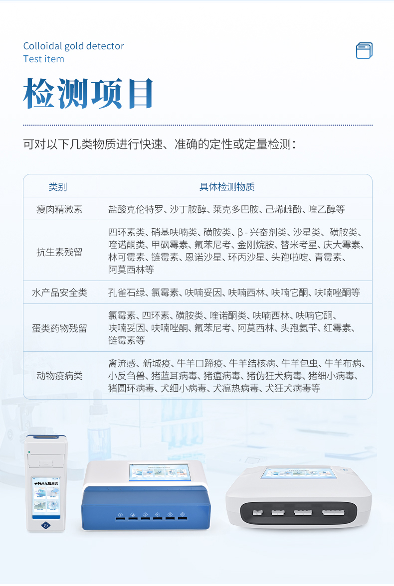 獸藥殘留快速檢測儀是指用于檢測動物源性食品(如肉類、蛋類、奶類、水產(chǎn)品、蜂蜜等)及其制品中殘留的獸藥(包括抗生素、激素、驅(qū)蟲藥、鎮(zhèn)靜劑、β-受體激動劑等)的儀器設(shè)備。