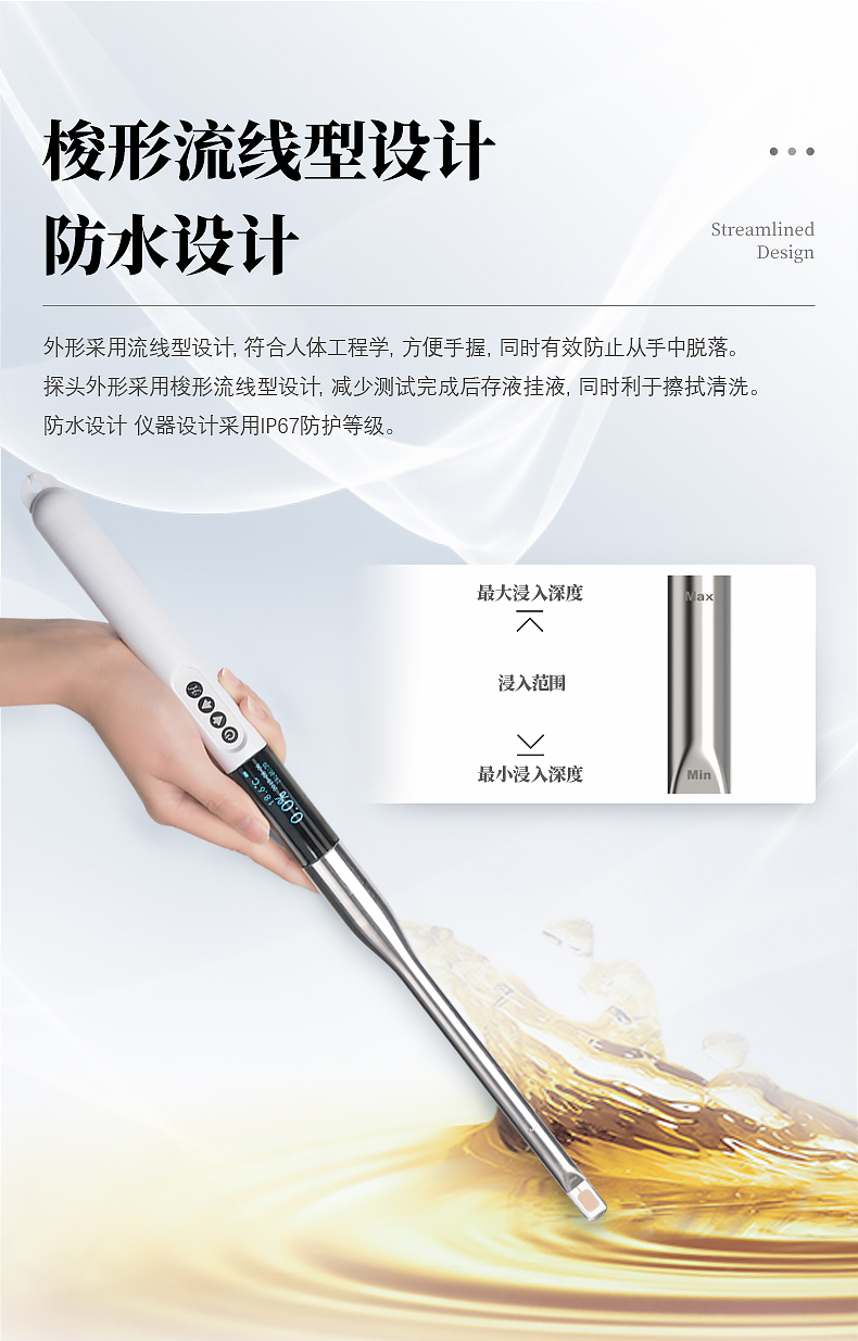 ■探頭外形采用梭形流線型設(shè)計,減少測試完成后存液掛液,同時利于擦拭清洗。