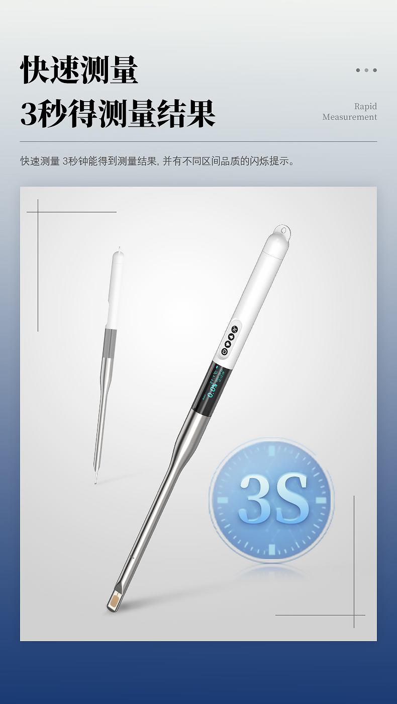 ■快速測量 3秒鐘能得到測量結(jié)果,并有不同區(qū)間品質(zhì)的閃爍提示。