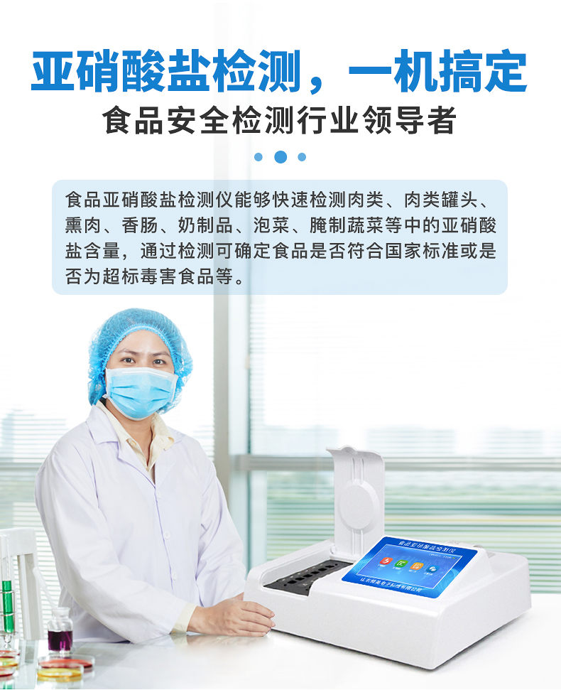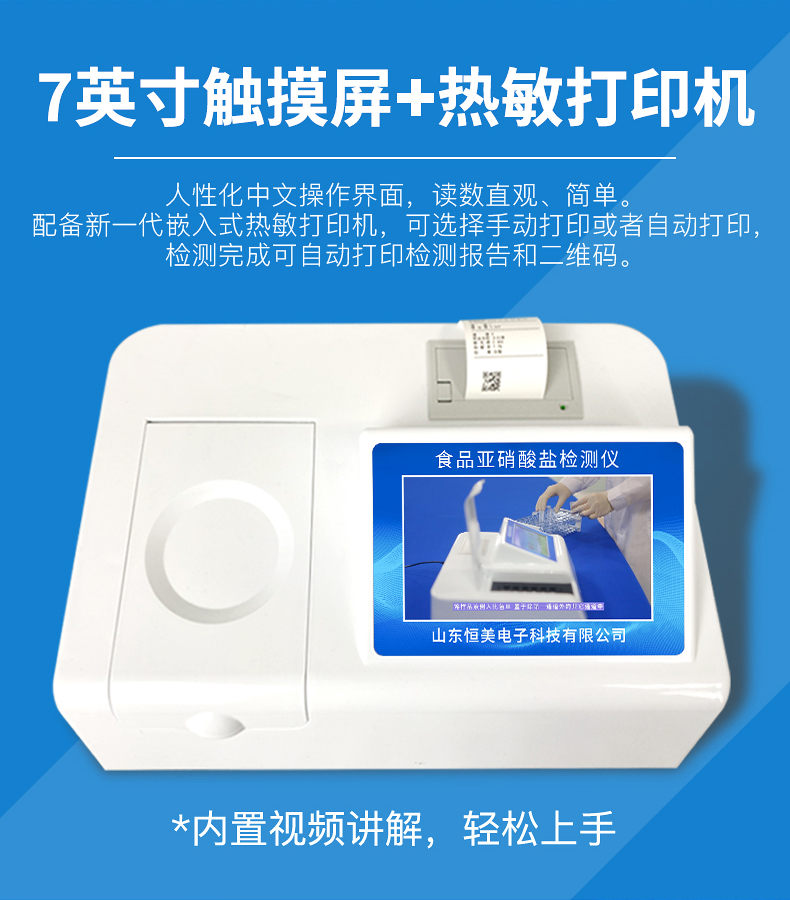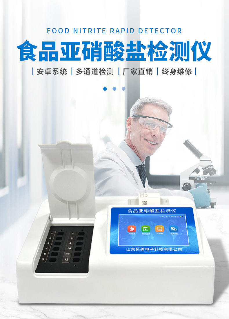 HM-Y12食品中亞硝酸鹽檢測儀器為集成化食品安全檢測分析設(shè)備,能夠快速檢測肉類、肉類罐頭、熏肉、香腸、奶制品、泡菜、腌制蔬菜等中的亞硝酸鹽含量;該儀器是根據(jù)GB5009.33-2010《食品中亞硝酸鹽與硝酸鹽的測定》,食品中的亞硝酸鹽經(jīng)過提取,與檢測試劑反應生成有色化合物,再利用亞硝酸鹽檢測儀測定其吸光度,在一定范圍內(nèi)吸光度與含量成正比。通過檢測可確定食品是否符合國家標準或是否為超標毒害食品等。儀器預留其他項目檢測程序和端口,根據(jù)日后需求可方便的自主增加檢測項目。日后可升級為檢測水產(chǎn)品、面制品的綜合類型儀器。