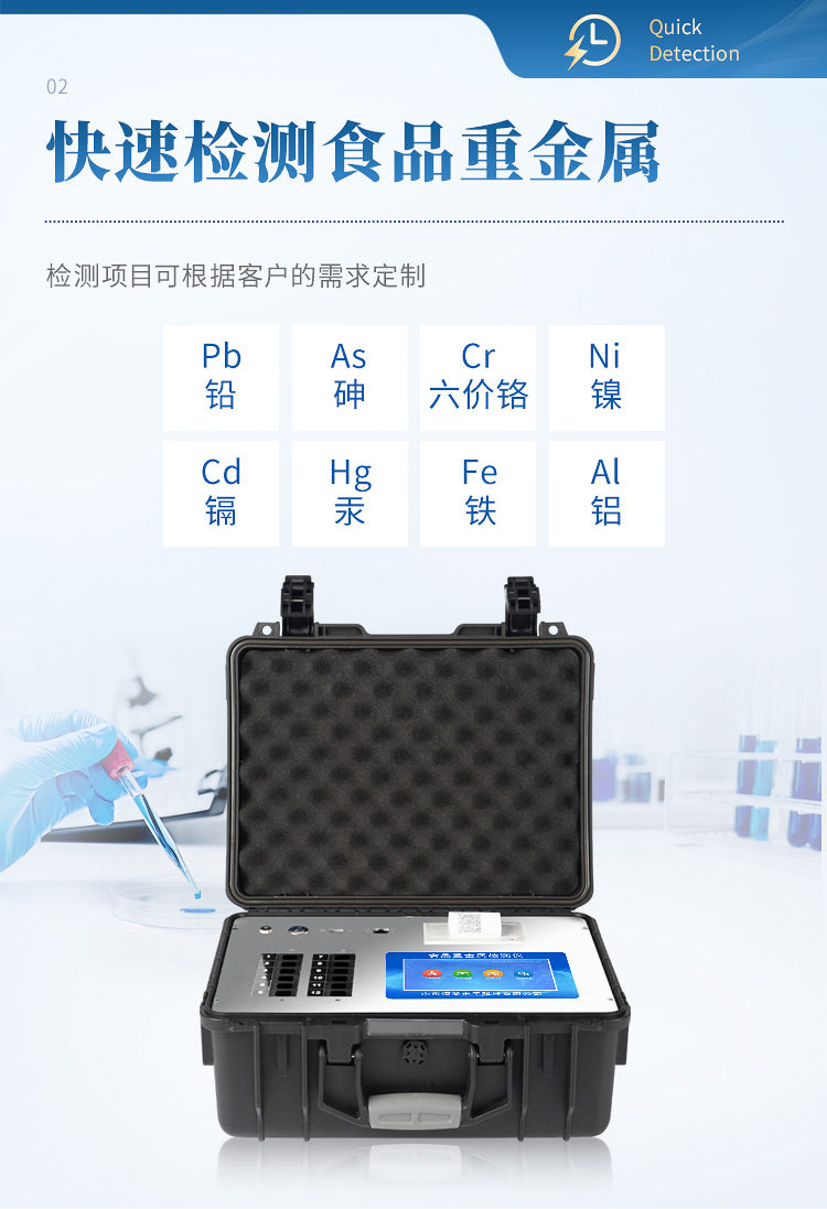 BZ01重金屬檢測儀可廣泛應用于大米、糧谷、果品、蔬菜、藥材、水質、水產品中重金屬鉛、鎘、六價鉻、汞、砷、鐵、鎳、鋁(任選1項)的快速檢測,檢測項目可根據客戶的需求定制。