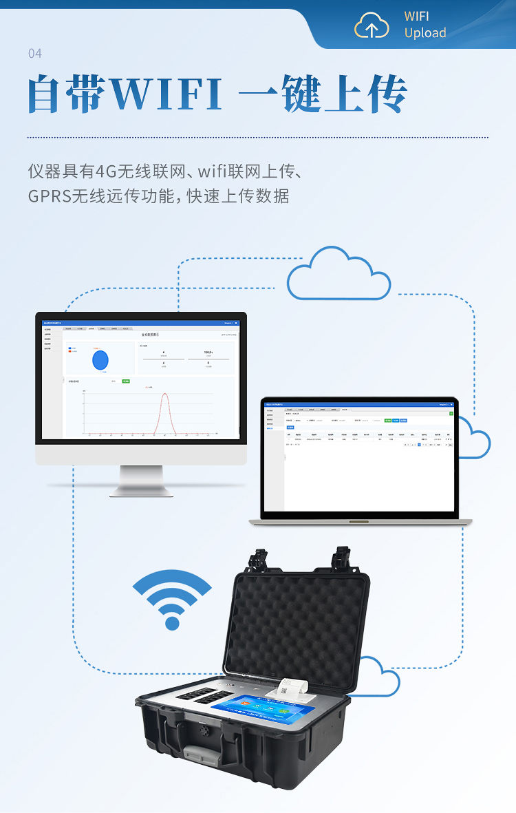 3、儀器具有4G無線聯(lián)網、wifi聯(lián)網上傳、GPRS無線遠傳功能,快速上傳數據。