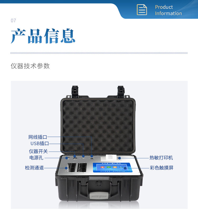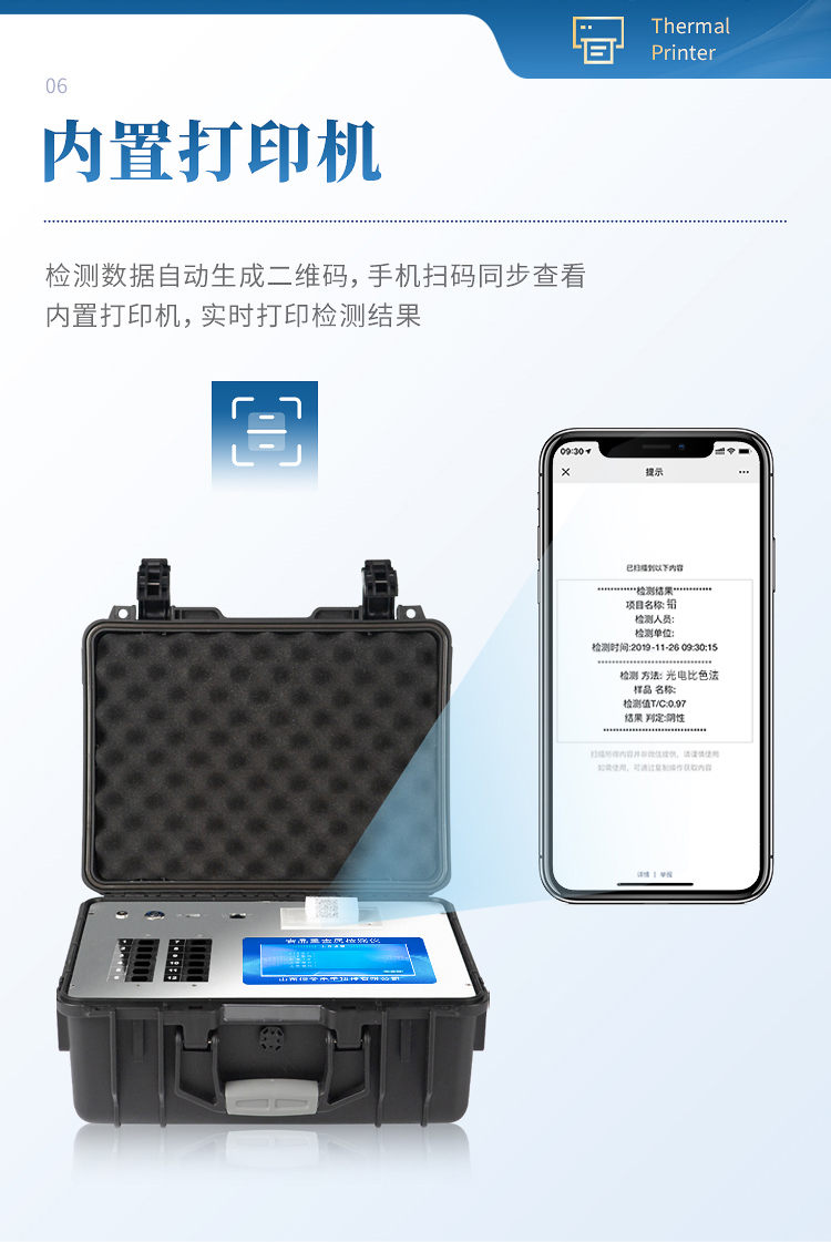 7、高速熱敏打印機,實時打印檢測結果。內置大容量電池,便于現(xiàn)場執(zhí)法檢測。